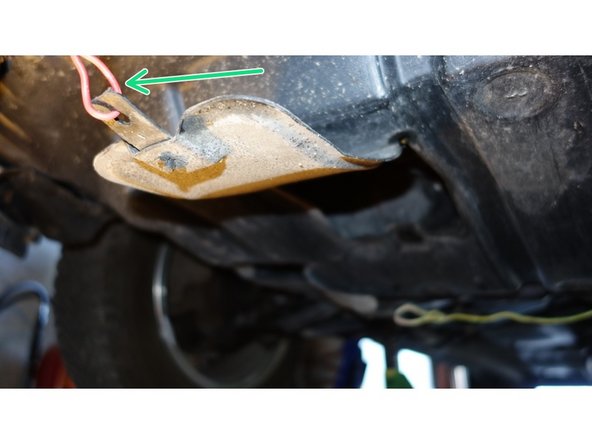 Avec un tournevis cruciforme moyen, dévisser la vis de clips en plastique (flèche rouge), et dé-clipser la trappe d'accès au filtre à huile.